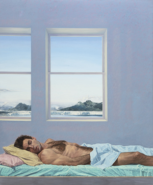 Diane Marsh’s paintings present imagery of conflict, contemplation, and resolution through her depiction of life-size and larger-than-life figures juxtaposed with objects of nature or text. Although painted in a hyper-realist manner (artwork akin to high resolution photography) Marsh’s work almost surpasses meticulous renderings by often painting her subject’s skin as nearly translucent, revealing veins flowing with blood or red, almost raw skin surfaces. By doing such, the artist conveys vulnerability and emotion. Often in her work, Marsh includes words from world philosophers and in "The Ending of Sorrow", Marsh references the late writings of Jiddu Krishnamurti, an Indian philosopher and writer.